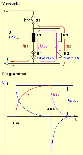 Beim Ausschalten verhindert die Selbstinduktionsspannung der Spule den plötzlichen Stromabfall. Die Spule wird zur Stromquelle, die eine so hohe Spannung erzeugt, dass der Strom im Stromkreis L1 - H1 - H2 - R1 kurzzeitig weiterfließt. Da der Strom in der 10W-Lampe H1 vorher ungefähr 10mal höher war als in der 1W-Lampe H2, wird die Lampe H2 jetzt kurzzeitig 10-fach überlastet (120V)! - Siehe Schaltung und Diagramme!