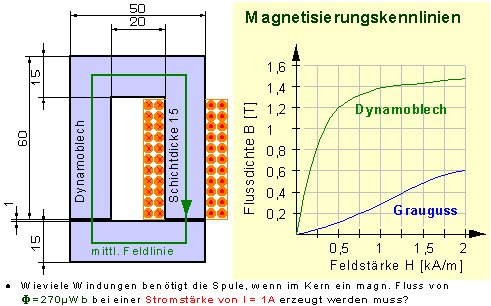 Notwendige Feldstärke im Eisen aus Magnetisierungskennlinie: HFe = 500 A/m